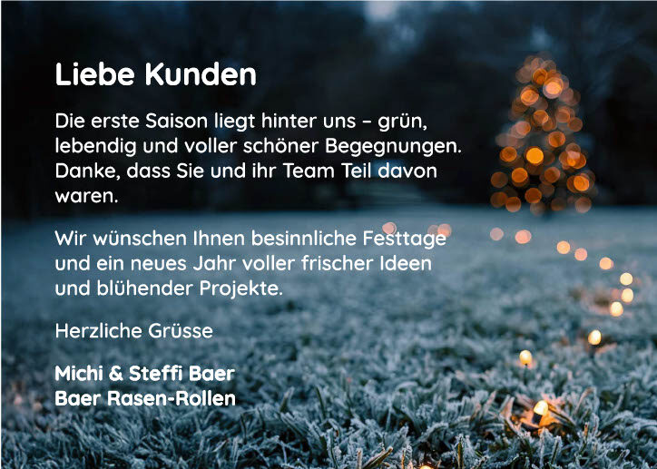 Ein besonderes Highlight erwartet uns im Jahr 2025: Wir starten mit der Produktion von Rollrasen! Mit grosser Dankbarkeit übernehmen wir diese Tätigkeit von unserem Nachbarn Edi Arnold (ehemals RASEN-ROLLEN ARNOLD GmbH) und freuen uns darauf, seine Tradition in unserem Betrieb fortzuführen und weiterzuentwickeln.